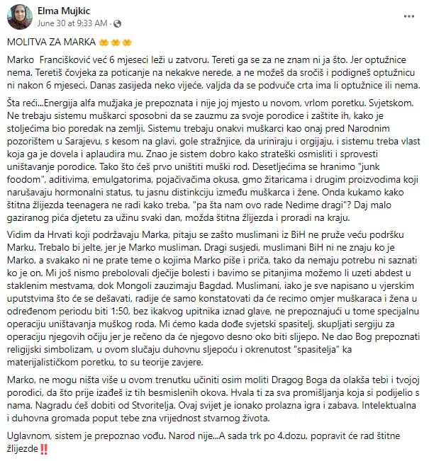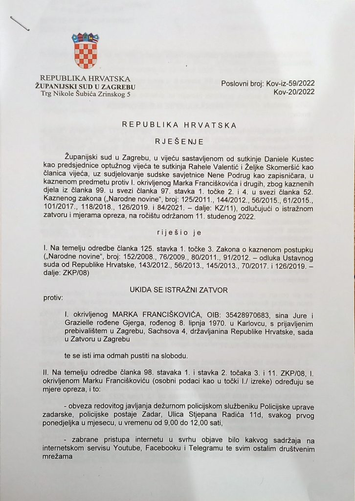 22,12.2022. u 14:52 dvojica policajaca zadarske policije dolaze u dom Marka Franciškovića s rješenjem visokog kaznenog suda po kojem je uvažena žalba DORH-a na odluku Županijskog suda u Zagrebu o ukidanju mjere opreza za Marka Franciškovića te ga odvode u Remetinec nakon što je 42 dana proveo na “slobodi” čekajući potvrđivanje ili odbacivanje optužnice koja …
