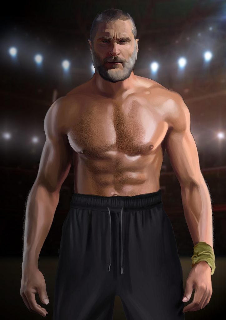 – galami najavljivač u najboljoj maniri Las Vegasa i Dok King vođenog spektakla. Publika je u ekstazi čiji je vrhunac kad u ringu pravosudna policija skida lisice i lance. Izazivač skida sa sebe zeleni ogrtač i pozdravlja publiku istovremeno dajući na uvid atletski isklesano tijelo, napeto, eksplozivno i spremno za borbu do pobjede. Svjetina je oduševljena. Osjeća da bi mogla utažiti svoju žeđ za krvlju. Cijela “Arena” se doslovno trese i vibrira od masovne usklađene frekvencije ne samo glasnica, nego i otkucaja srca. Sve udara, sve se trese… Odor znoja sve skupa kao da opija svojim feromonskim i testosteronskim narkotičkim efektima…