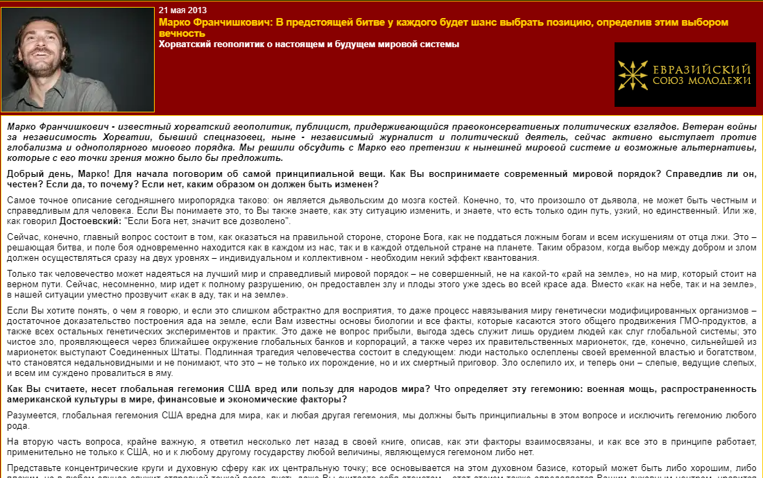An interview from May 21st, 2013 with Alexander Bovdunov (Aleksandar Dugin’s assistant) for a Russian geopolitical online magazine. Source: http://rossia3.ru/politics/foreign/franciskovic May 21, …