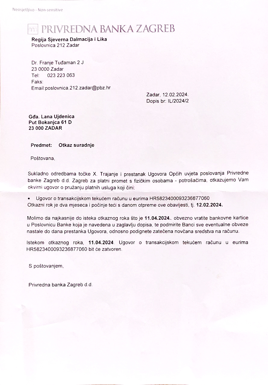 Nakon Zagrebačke banke (15.05.2022.) i Hrvatske poštanske banke ( 18.09.2023.), ovoga puta Privredna banka Zagreb (16.02.2024.) ukida Račun obitelji Francišković bez objašnjenja. …
